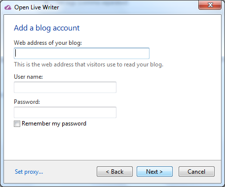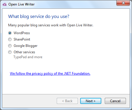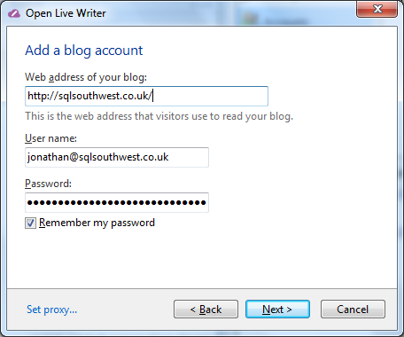 My particular problem didnt get resolved, I think there are issues concerning the way my other blog is hosted/managed but  that isnt the point. I tried connecting Open Live Writer (OLW) to my user group blog and had no issues at all so here is the step by step on how to get it done. If you havent heard of OLW then take a look at their website and on Scott Hanselman’s blog for a potted history of this great app.